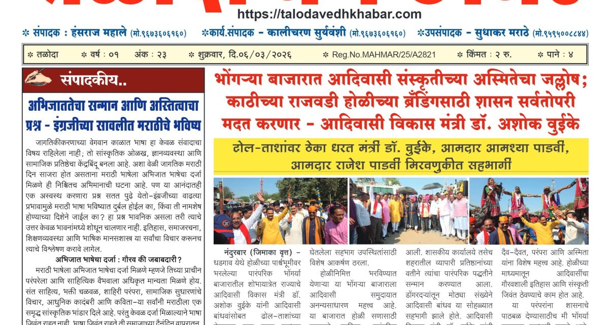 पान क्रमांक – १ पान क्रमांक – २ पान क्रमांक – ३ पान क्रमांक – ४ तळोदा वेध खबरआजच्या वेगवान विज्ञान आणि तंत्रज्ञानाच्या युगात माहितीचे स्वरूप बदलले आहे. वाचकांना तत्काळ, अचूक आणि विश्वासार्ह माहिती उपलब्ध व्हावी या उद्देशाने साप्ताहिक तळोदा वेध खबर आधुनिक डिजिटल प्लॅटफॉर्मच्या माध्यमातून आपल्या सेवेत सादर करण्यात आले आहे. पारंपरिक पत्रकारितेची मूल्ये […]